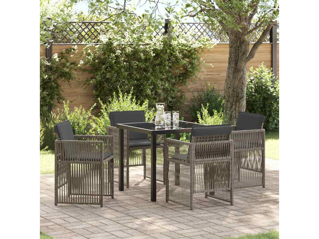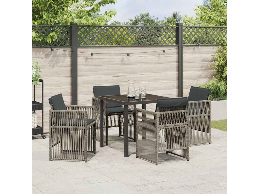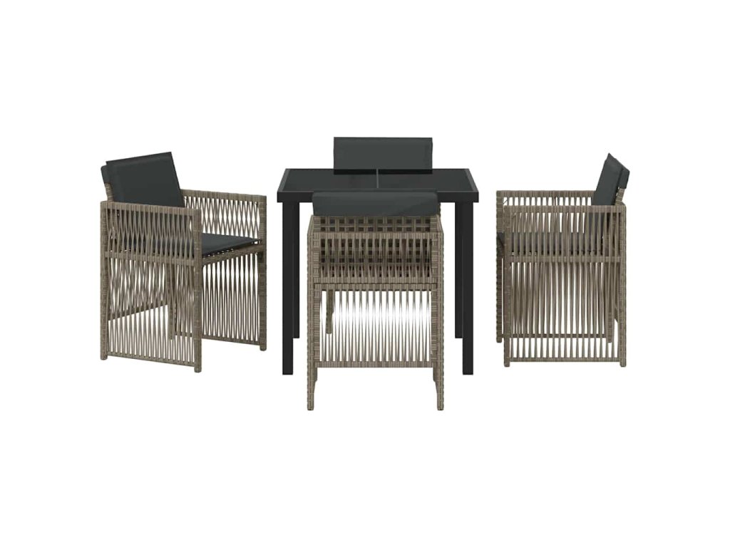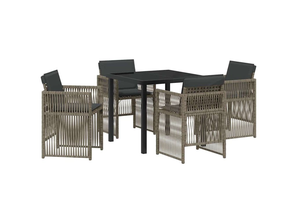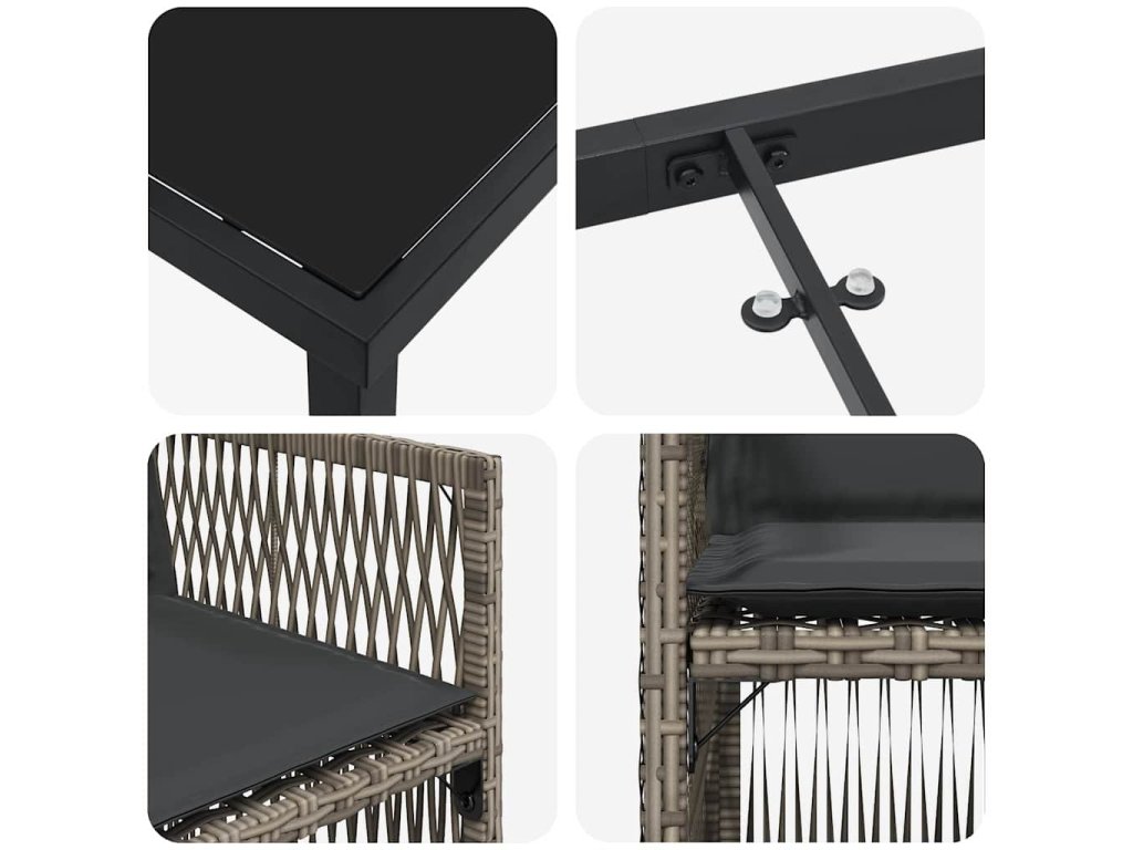 - Materiály: Tento moderní zahradní jídelní set je vyroben z práškově lakované oceli, což zajišťuje pevnost i odolnost vůči povětrnostním podmínkám. Tím se set stává dlouhotrvajícím centrem vašich venkovních prostor. Poly ratan na opěrkách navíc zvýrazňuje pohodlí a styl celého setu.