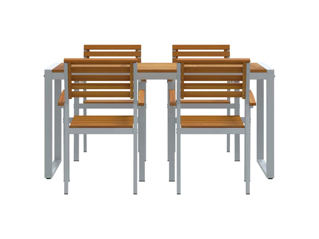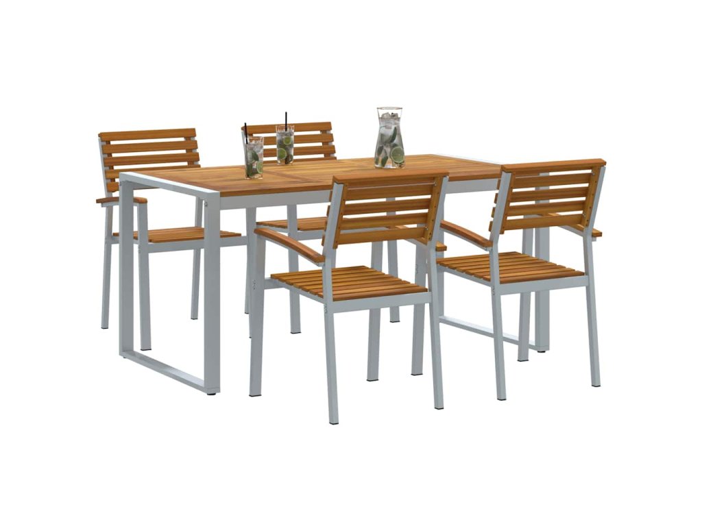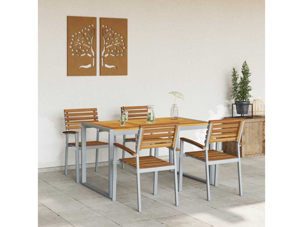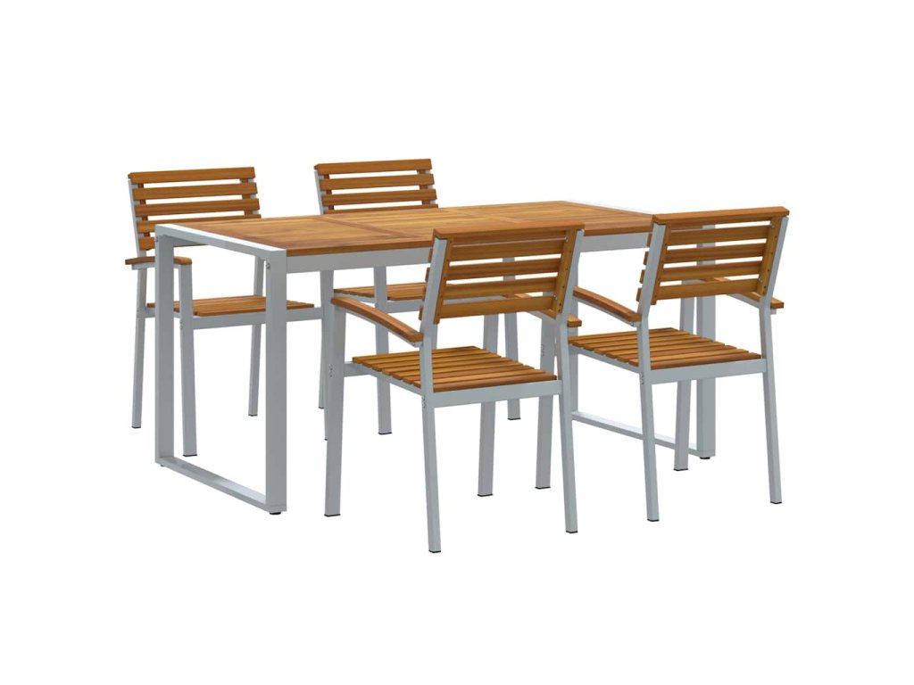 - Funkční komponenty Set obsahuje obdélníkový stůl a další židle s akáciovými deskami. Pevné ocelové nohy mu dodávají dlouhou životnost a pohodlné opěrky a sedadla jsou ideální na dlouhá jídla, protože vytváří příjemnou atmosféru.