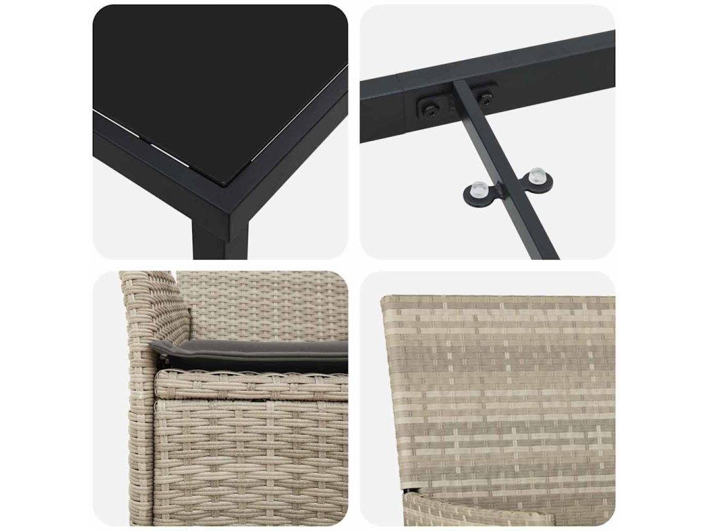 - Tkaný polyratan: Souprava je vyrobená z jemně tkaného polyratanu, který dodává eleganci a zajišťuje odolnost. Je odolný vůči UV záření a počasí, díky čemuž souprava vypadá skvěle i po delší době venku.
