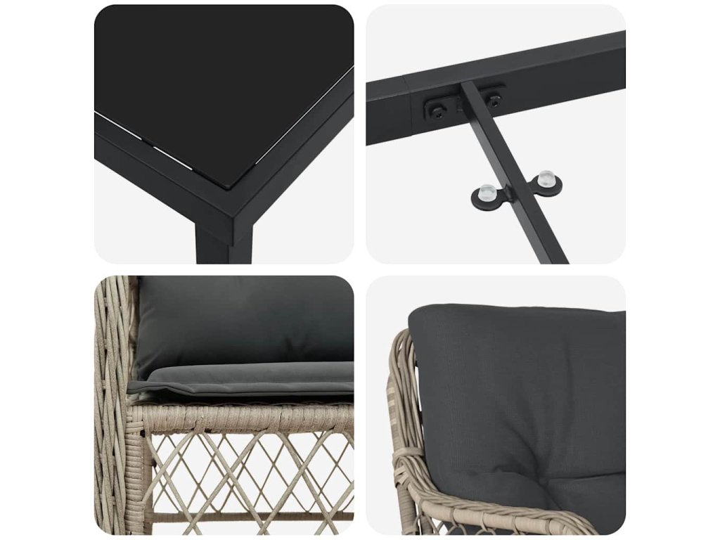 - Funkční designové prvky Set má stůl z tvrzeného skla, který spojuje styl a praktičnost. Tenhle čistý povrch udržuje vzhled v pěkném stavu a poskytuje pevné místo pro jídlo a pití. Je navíc odolný vůči špatnému počasí, což zvyšuje jeho trvanlivost.