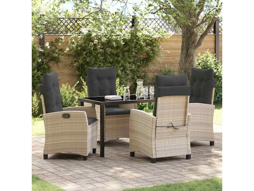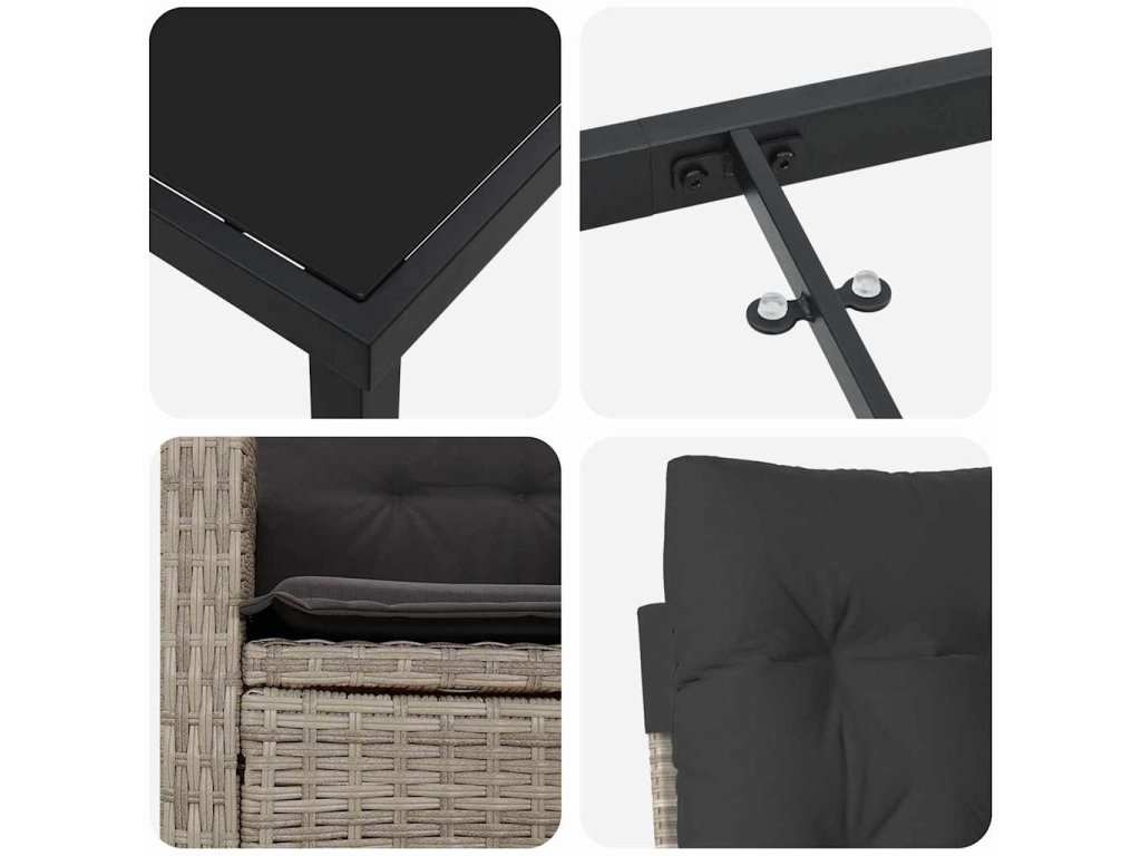 - Materiály: Zahradní jídelní set je vyrobený z elegantní kombinace poly ratanu, oceli a skla. Poly ratan vypadá skvěle a odolává počasí, ocel dodává pevnost a skleněný povrch je elegantní a snadno se čistí. Ta kombinace zajistí, že to vydrží a bude to vypadat dobře dlouho, připravené na všechno od deště po slunečné odpoledne.