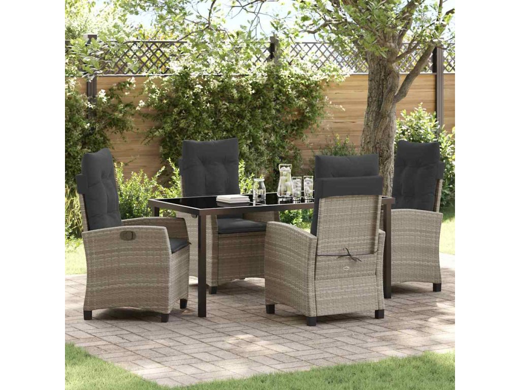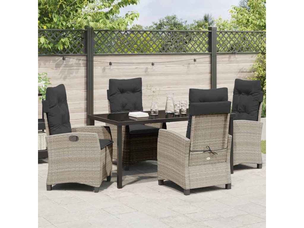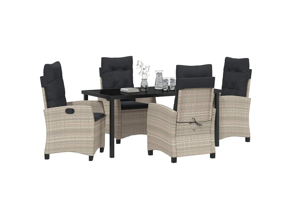 - Materiály: Zahradní jídelní set je vyrobený z elegantní kombinace poly ratanu, oceli a skla. Poly ratan vypadá skvěle a odolává počasí, ocel dodává pevnost a skleněný povrch je elegantní a snadno se čistí. Ta kombinace zajistí, že to vydrží a bude to vypadat dobře dlouho, připravené na všechno od deště po slunečné odpoledne.