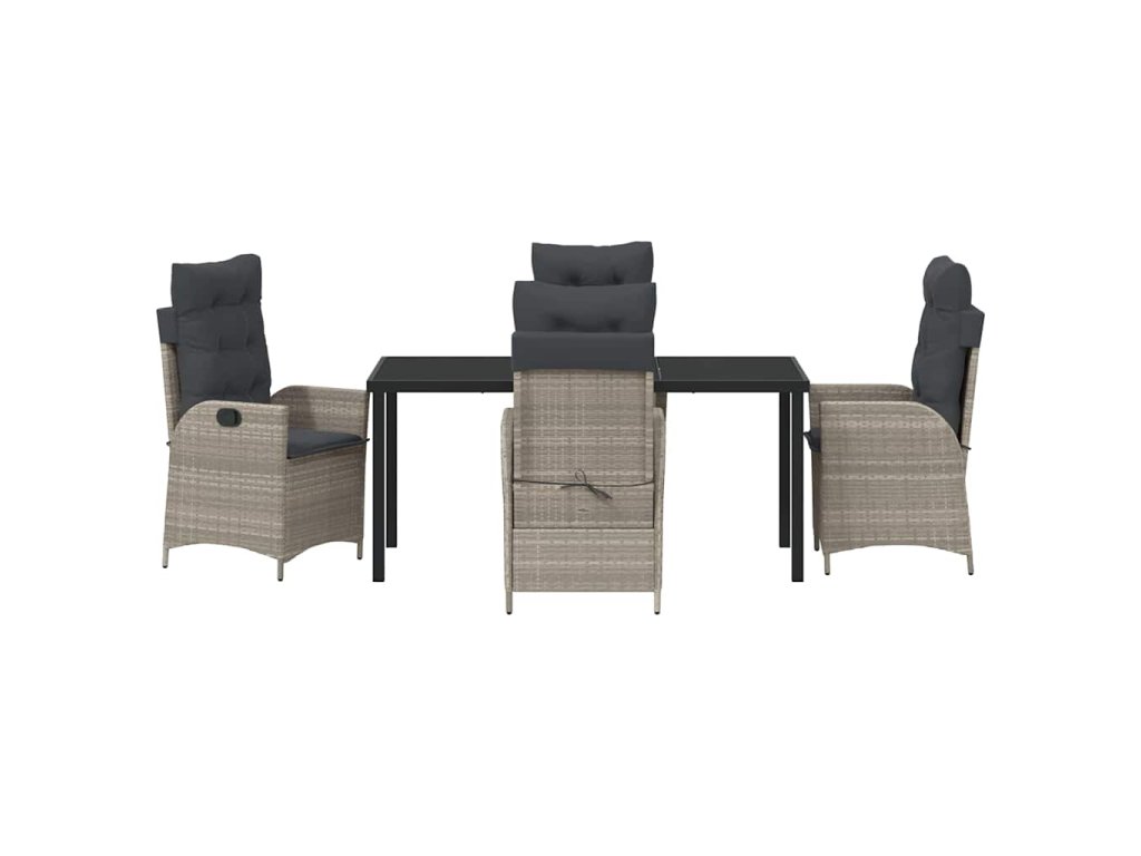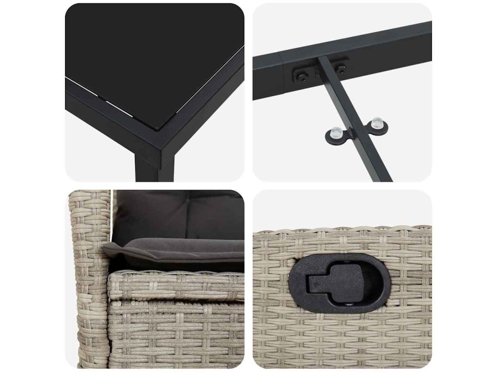 - Materiály: Set je vyroben z kvalitního poly ratanu, oceli a skla. Poly ratan dodává příjemnou texturu a elegantní touch, a skvěle odolává letnímu počasí. Ocelová konstrukce zajišťuje silnou oporu a stabilitu, zatímco skleněná deska je elegantní a lehce se čistí.