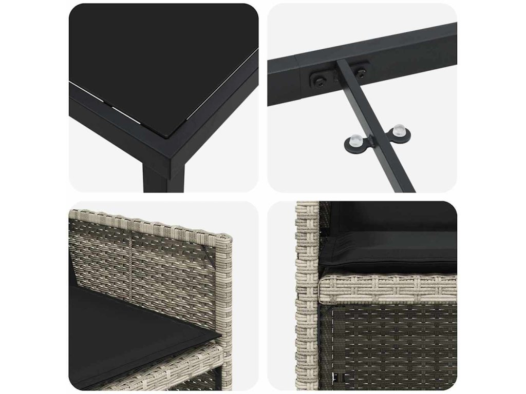- Moderní materiály: Tento set je udělaný z chytré směsi poly ratanu a skla, což mu dodává originální styl. Poly ratan je známý svou odolností vůči počasí a barvy si dlouho udržuje. Skleněné povrchy přidávají elegantní a moderní vzhled, který skvěle vypadá venku a snadno se čistí.