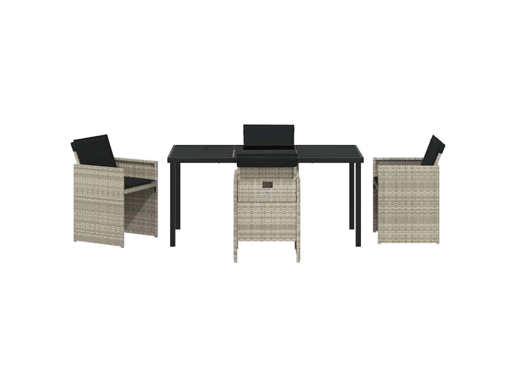 - Moderní materiály: Tento set je udělaný z chytré směsi poly ratanu a skla, což mu dodává originální styl. Poly ratan je známý svou odolností vůči počasí a barvy si dlouho udržuje. Skleněné povrchy přidávají elegantní a moderní vzhled, který skvěle vypadá venku a snadno se čistí.