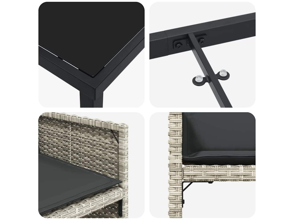 Tento úžasný zahradní lounge set perfektně spojuje moderní design s užitečností, což z něj dělá skvělou volbu pro venkovní relaxaci a akce. Je určen pro ty, kdo chtějí elegantní a moderní vzhled s čistýma línijema a bez zbytečností. Ideální pro zahrady a terasy, stane se krásným středobodem, který vybízí přátele a rodinu k odpočinku v pohodlí a stylu vedle nádherné přírody.