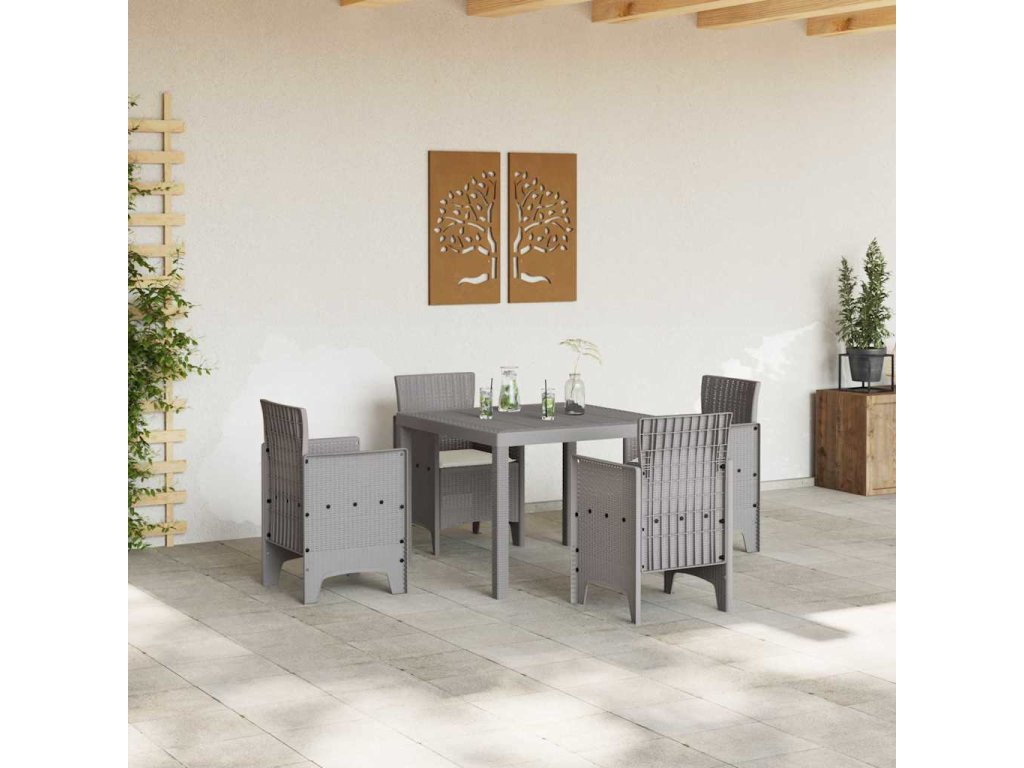 Tento moderní zahradní jídelní set přináší sofistikovanost a funkčnost do různých venkovních prostor. Ideální pro venkovní stolování na terase nebo v zahradě, tento set spojuje elegantní linie s texturovaným povrchem, aby poskytl stylový zážitek při jídle. Skvělý pro letní setkání a venkovní stolování, tento set nabízí pohodlí a pohodlné posezení, včetně polštářů pro každý sedák. Čtvercový stůl a odpovídající židle snadno doplní moderní designy, poskytují elegantní a zároveň neformální prostředí pro rodinné jídla nebo společenská setkání.