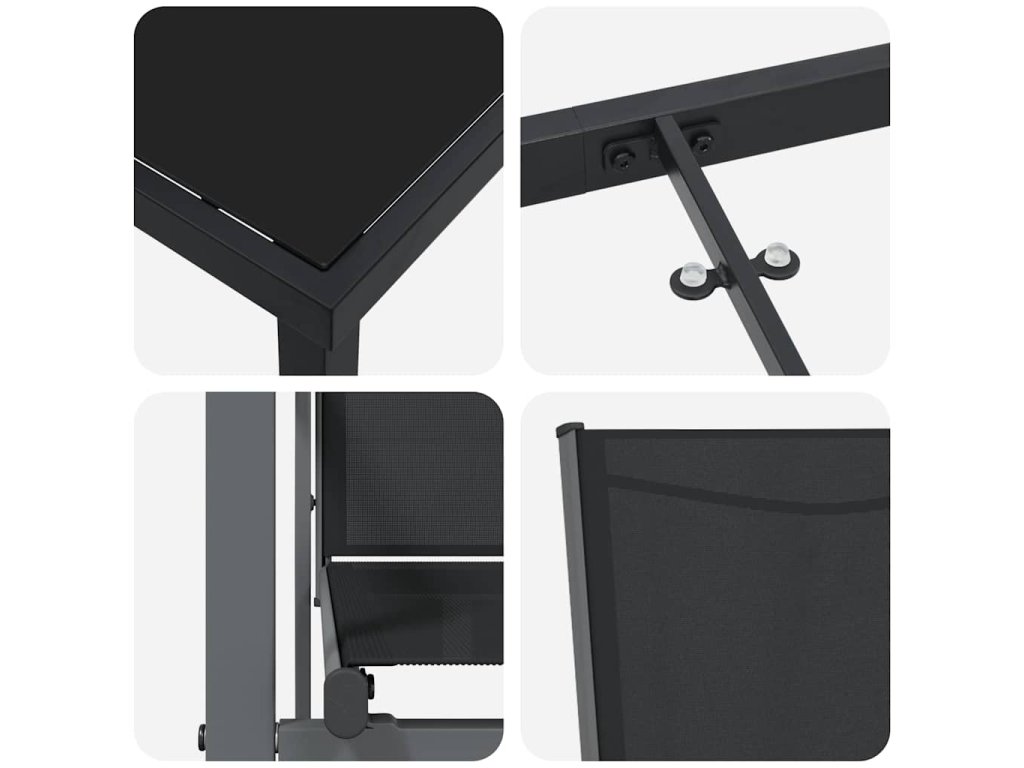 Tento moderní jídelní set do zahrady je úžasný pro vaši zahradu nebo terasu a dodá tomu kousek moderního stylu pro venkovní setkání v teplejších měsících. S elegantními liniemi a hladkým černým povrchem se skvěle hodí do moderních venkovních prostředí. Navržený jak pro styl, tak pro pohodlí, je to skvělé místo pro rodinná jídla, pokecání s přáteli nebo chvíle odpočinku pod otevřeným nebem.