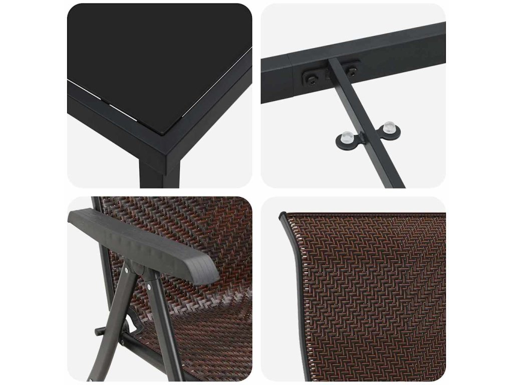 - Součásti: Set zahrnuje poly ratanová sedadla s oporou zad a pohodlnými loketními opěrkami. Stůl s temperovaným sklem poskytuje hladký a stabilní povrch, ideální pro stolování nebo jiné aktivity. Všechny části, od práškově lakovaných ocelových nohou po tkané poly ratanové opěrky, spolu dokonale spolupracují, aby zajistily pohodlí a stabilitu.