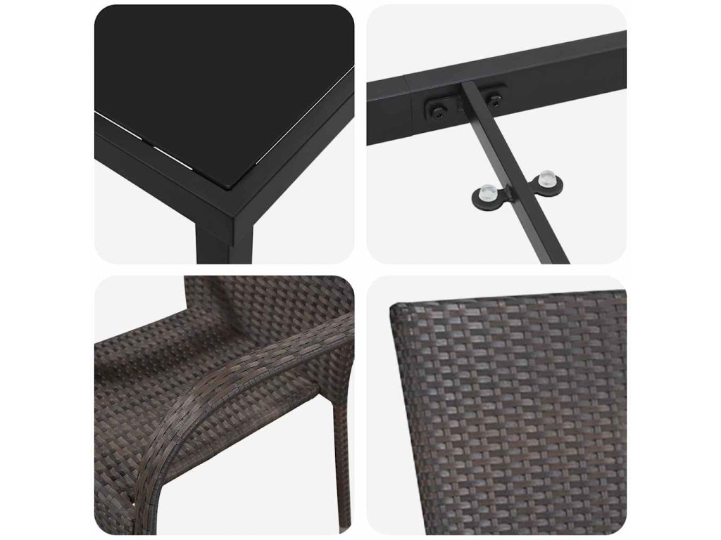 Tahle zahradní nábytková sada přináší moderní eleganci do vašeho venkovního prostoru. Je navržená tak, abyste si mohli pohodlně posedět venku, spojuje styl s praktičností. Moderní vzhled se skvěle hodí na balkóny, terasy nebo do zahrad a dodává jim elegantní atmosféru. Pozvěte kámošky a rodinu a užijte si jídlo, povídání nebo prostě jen relaxaci na slunci nebo pod hvězdami.