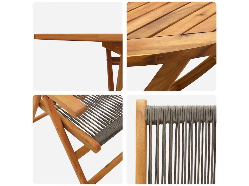 - Skvělý materiály: Udělaný z masivního akáciového dřeva a polyratanu, tenhle jídelní set je odolnej a dlouho vydrží. Dřevo je ošetřené olejem, aby odolávalo vlhkosti a zvýraznilo přirozenou barvu. Perfektní pro venkovní použití, tyhle materiály dodávají tvý zahradě živou atmosféru.