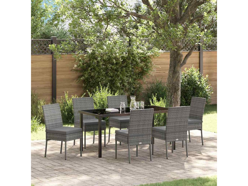 Tahle krásná zahradní jídelní souprava dodá vašemu venkovnímu prostoru moderní šmrnc a elegance se mísí s prvotřídní funkčností. Má obdélníkový stůl a pohodlné židle, ideální na venkovní stolování na zahradě nebo terase, skvěle spojuje eleganci s praktičností. Díky svému tkanému vzhledu a šik stylu dělá každé venkovní setkání stylové a nezapomenutelné.