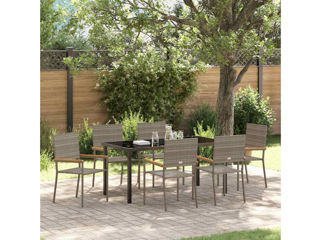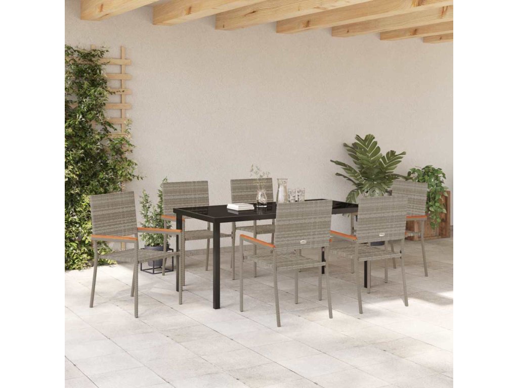 - Součásti: Každý kousek má poly ratanové opěrky, ocelové rámy a tvrzené skleněné desky, což zajišťuje, že všechno vypadá skvěle a dlouho vydrží. Pevné akáciové dřevěné opěrky na ruce dodávají příjemný dotek a pohodlí.