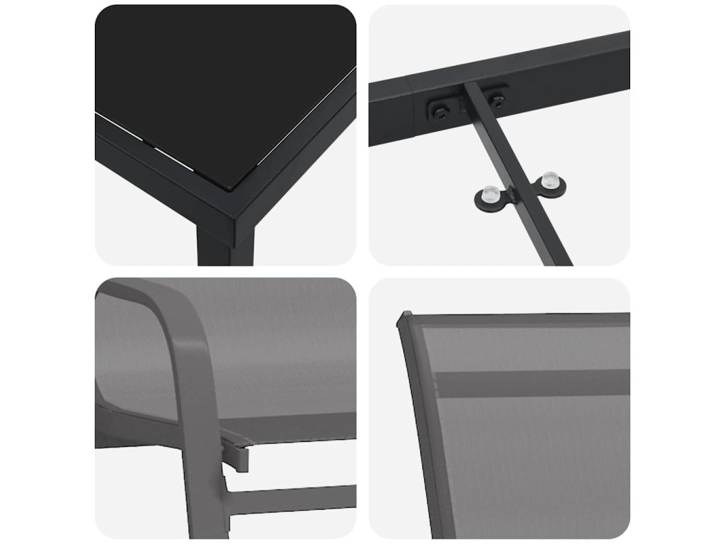 - Odolná konstrukce Vyrobený z práškově lakované oceli a tvrzeného skla, tenhle set má sílu i styl. Robustní ocelový rám poskytuje skvělou podporu, zatímco elegantní povrch tvrzeného skla dodává dotek třídy vašemu jídelnímu zážitku. Tyhle kvalitní materiály zajišťují, že set vydrží sezony a přidá eleganci vašim venkovním prostorům.