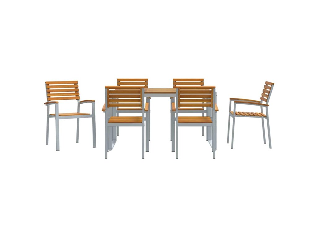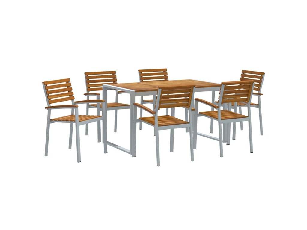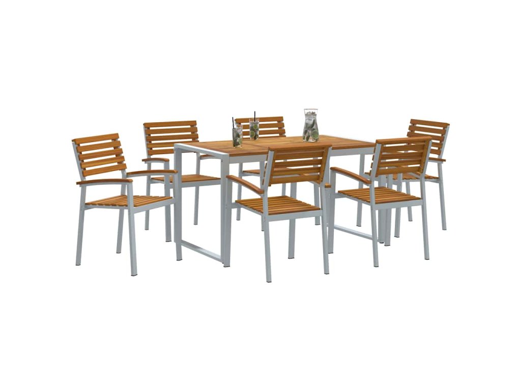 - Funkční komponenty Set obsahuje obdélníkový stůl a další židle s akáciovými deskami. Pevné ocelové nohy mu dodávají dlouhou životnost a pohodlné opěrky a sedadla jsou ideální na dlouhá jídla, protože vytváří příjemnou atmosféru.