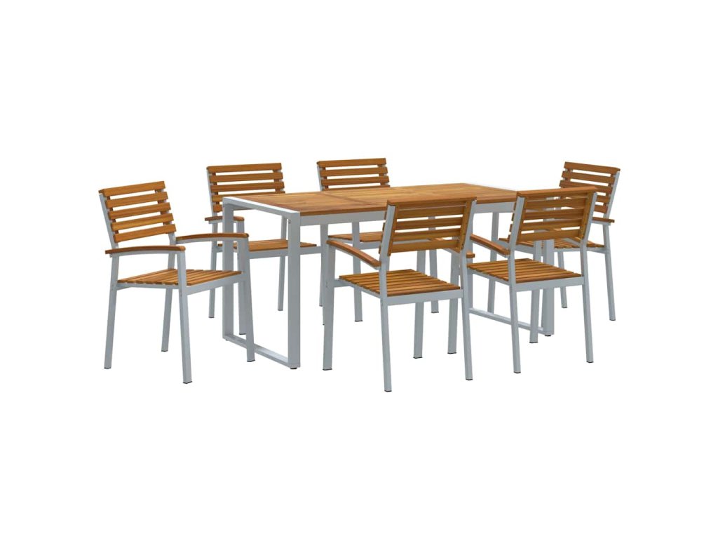 - Funkční komponenty Set obsahuje obdélníkový stůl a další židle s akáciovými deskami. Pevné ocelové nohy mu dodávají dlouhou životnost a pohodlné opěrky a sedadla jsou ideální na dlouhá jídla, protože vytváří příjemnou atmosféru.