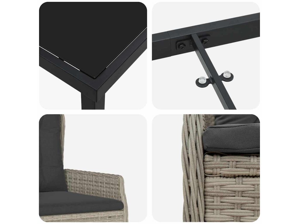 - Maximální Komfort – Ergonomicky navržená poly ratanová opěradla a podpěry na ruce, spolu s nastavitelnými opěradly, ti zajistí maximální pohodlí. Tyto funkce ti umožňují užívat si jídlo venku v pohodlí, což skvěle zapadá do moderního pojetí jednoduchosti a praktičnosti tohoto setu.