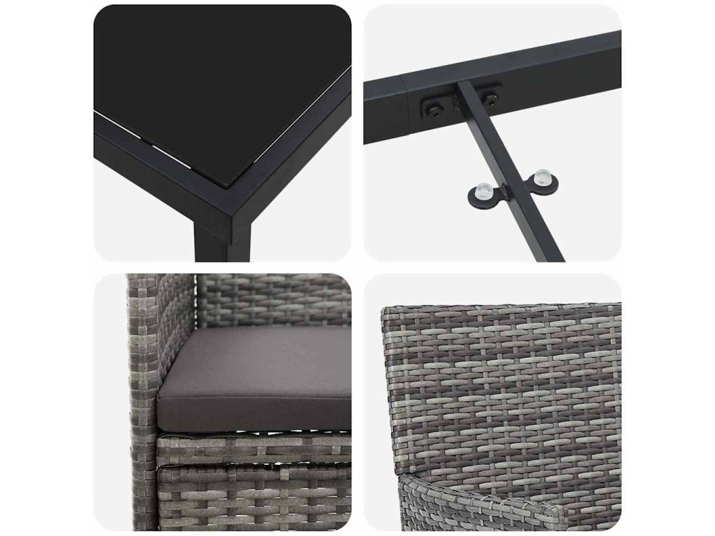 - Elegantní moderní design: Zahradní jídelní set má současný vzhled s ostrými liniemi a čistým stylem. Skvěle se hodí do jakéhokoli venkovního prostoru a zároveň ukazuje svou eleganci.