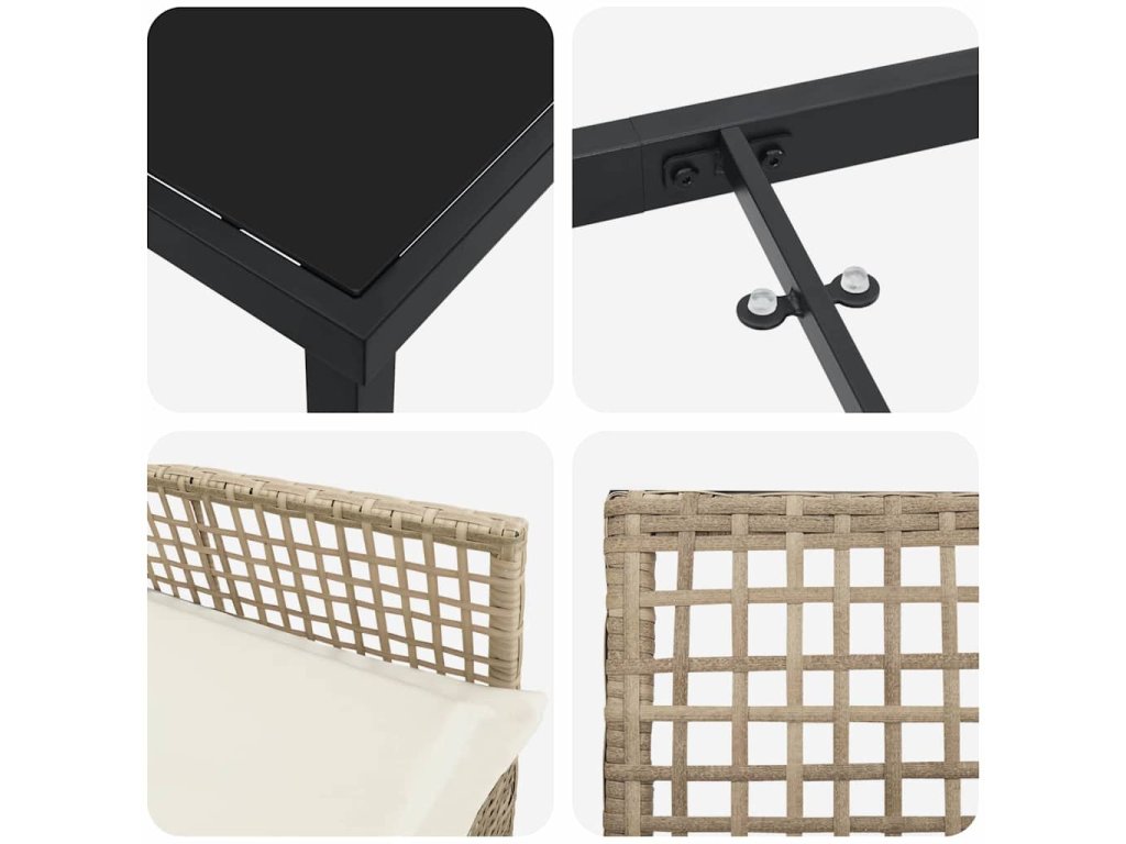 - Kompletní set: Obsahuje vše potřebné včetně stabilního skleněného stolu, pohodlných polštářů z poly ratanu a pevných nohou. Každý prvek je funkční, spojuje komfort a praktičnost pro bezproblémové venkovní aktivity. Set dělá z venkovního stolování příjemný zážitek a je ideální pro rodinná jídla nebo večírky s přáteli.