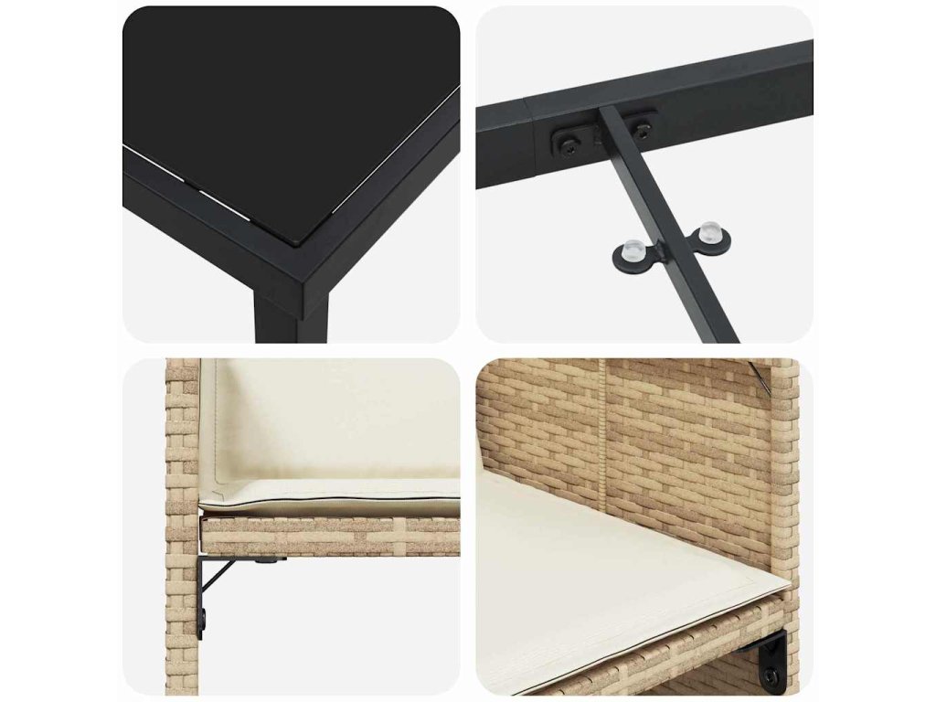 - Komponenty: Skládací prvky s praktickým klapkovým systémem na polštářích sedáku pro pohodlí, jsou vyrobeny z odolné látky pro dlouhé venkovní používání. Stůl z tvrzeného skla dodává eleganci a také zůstává praktický.