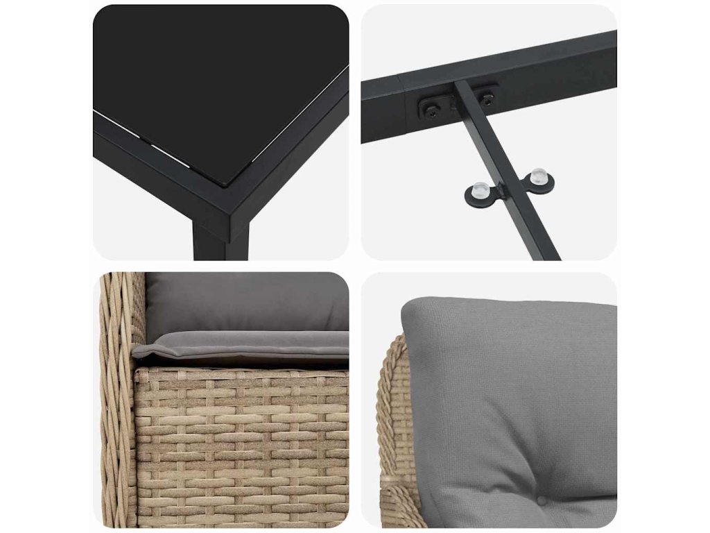 - Stylové komponenty: S plochými opěrkami rukou a zádovými opěrkami z poly ratanu je tento set pohodlný a vypadá skvěle. Každý kousek je navržen tak, aby poskytoval příjemný zážitek při sezení a přitom si zachovává moderní vzhled.