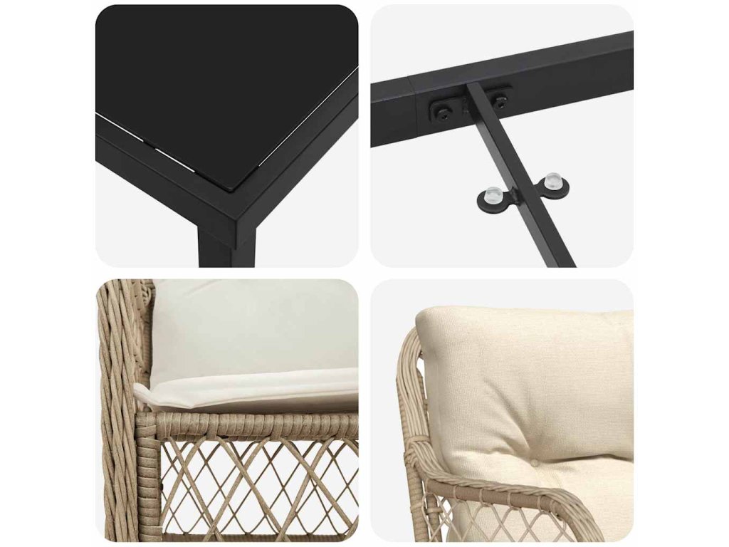 - Ergonomické vlastnosti S pohodlným opěradlem z polyratanu a plochými opěrkami rukou je tento set postaraný o vaše pohodlí. Má silné práškově lakované ocelové nohy a rám, které poskytují stabilní oporu na každodenní používání. Tyto komponenty skvěle spolupracují a zajišťují vám pohodlný zážitek při sezení.