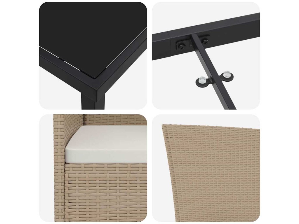 Materiály, suitable for co něco vydrží: Set je vyrobený z polyratanu a práškově lakované oceli, které jsou známé svojí pevností. Polyratan má hladký, tkaný povrch, suitable for co dlouho vydrží, a ocel poskytuje solidní oporu. Nevybledne, nedeformuje se a nekoroduje, takže víš, že tu bude léta. Navíc, tyhle materiály znamenají, že se o údržbu nemusíš moc starat. Vybavený set: Obsahuje pohodlné polštáře a odolný skleněný stůl, takže máš to nejlepší z obou světů. Polštáře snadno sundáš pro úklid a sklo je elegantní a lehce se čistí. Společně vytvoří příjemné místo na odpočinek, ať už pořádáš párty nebo si užíváš klidné chvíle. Funkční design: Chytrý design znamená, že ho můžeš využít na spoustu různých věcí. Je ideální na jídlo, pokec nebo prostě lenošení. Nábytek se rychle změní z uvolněného na fancy, takže se skvěle hodí pro jakoukoli příležitost. Univerzální použití: Tenhle set se hodí kdekoli – na terase nebo v zahradě. Jeho moderní vzhled se skvěle doplňuje s různými styly, takže je super doplněk pro jakýkoli prostor. Ať už máš velký mejdan nebo klidnou chvilku, přizpůsobí se tomu, suitable for co potřebuješ. Údržba: Aby set vypadal pořád skvěle, zakryj ho, když ho nepoužíváš, a vyhýbej se drsným čističům. Tyto malé tipy pomohou zachovat jeho svěží vzhled a funkčnost, takže zůstane důležitou součástí tvého venkovního prostoru navždy.- Barva: Béžová