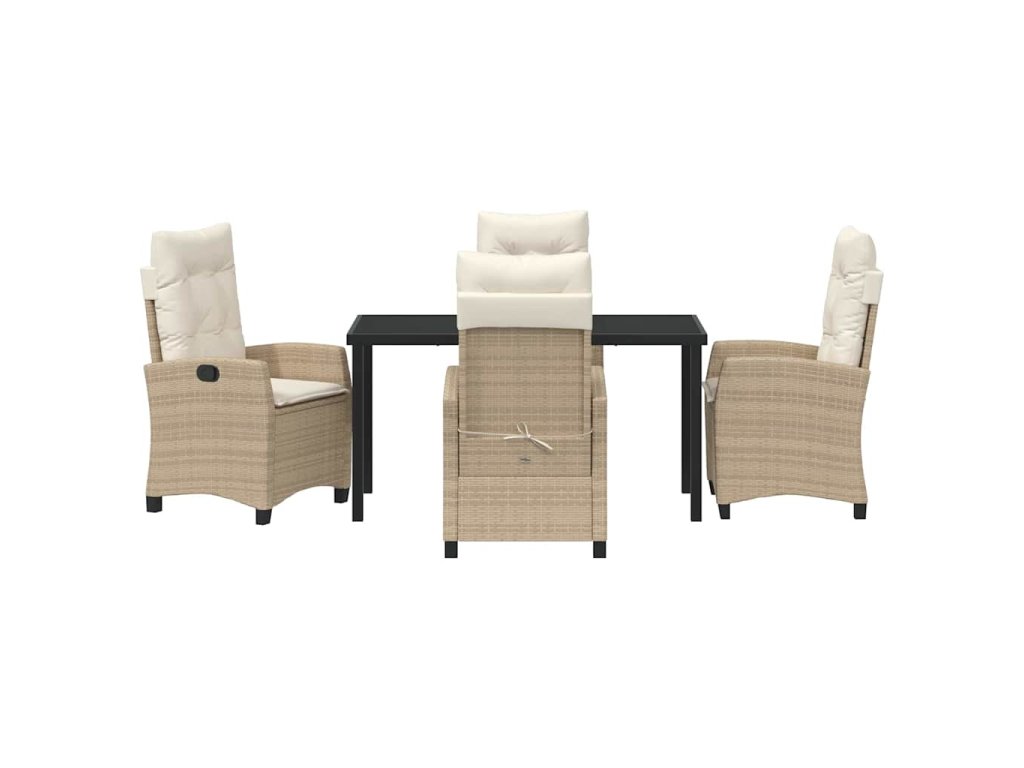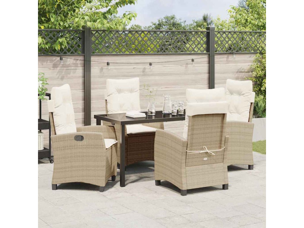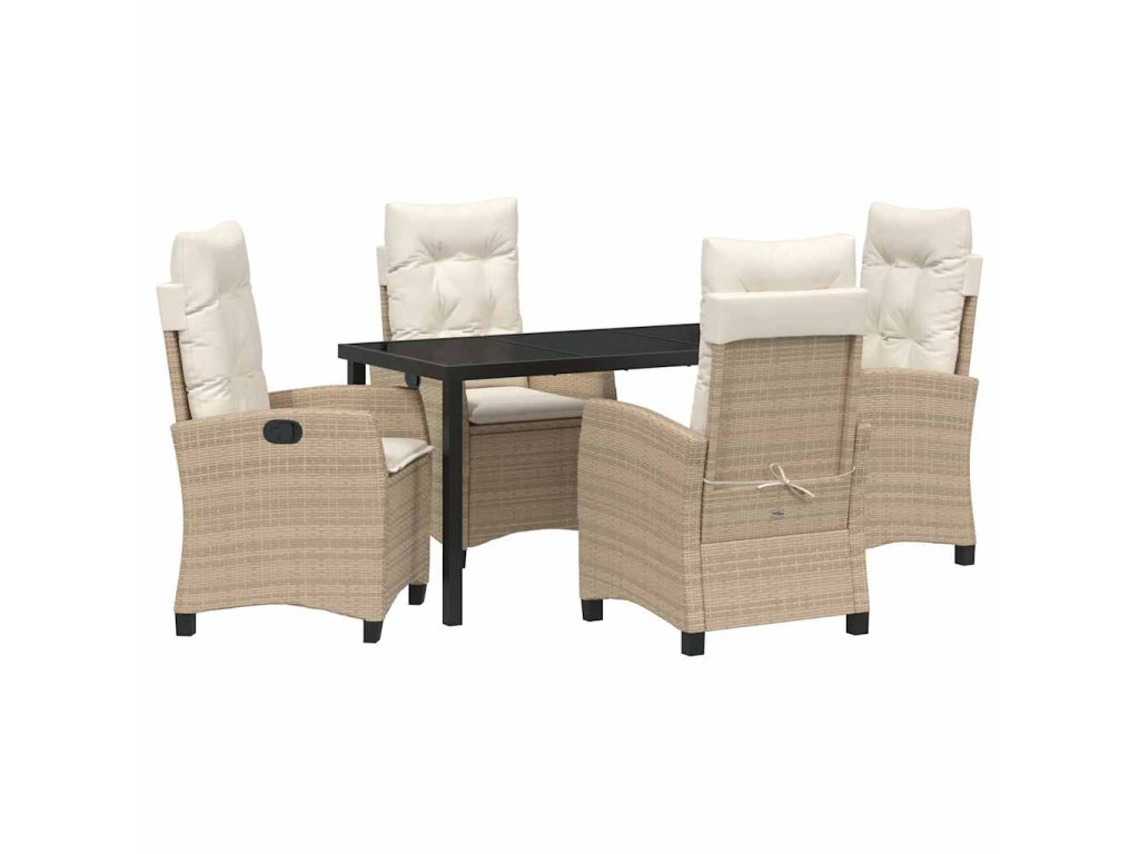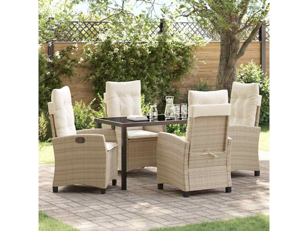 Materiály: Vyrobeno z odolného poly ratanu, tento jídelní set kombinuje styl s odolností. Tvrzené sklo zvyšuje jeho moderní vzhled a usnadňuje údržbu, takže se lehce čistí. Ocelové rámy dávají stabilitu a dlouhou životnost, bez ztráty stylu. Zahrnuté komponenty: Představ si příjemný zážitek díky sedacím polštářkům, co nabízejí pohodlí. Opěrky a lesklé nohy se skvěle doplňují. Skleněný stůl spojuje funkčnost s elegancí. Vícepolohová opěradla zajistí pohodlný relax s různými náklony. Funkce / Funkčnost / Design: Tento moderní zahradní set vyniká nastavitelnými opěradly, ideálními pro komfortní venkovní odpočinek. Ocelové nožky zajišťují robustní stabilitu, elegantní černý povrch ladí s jakýmkoli stylem. Manuální nastavení přidává praktičnost a spojuje formu s funkcí ve tvém zahradním ráji. Doporučené použití: Tento set je ideální pro zahradní a terasové stolování. Užij si víkendové brunch nebo večeře pod hvězdným nebem. Perfektně se hodí na různé příležitosti, od příjemných rodinných obědů po formální akce, a snadno zapadne do každého společenského prostředí. Péče a údržba: Pro dlouhou životnost používej ochranné kryty, když set není v provozu. Skleněný povrch stačí utřít, aby si zachoval lesk. Polštáře udržuj svěží sušením vzduchem, aby set zůstal příjemným místem pro nezapomenutelné chvíle venku.- Barva: Béžová