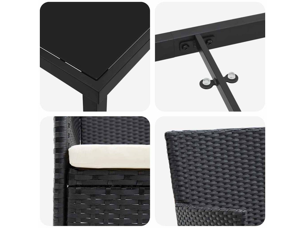 - Elegantní moderní design: Zahradní jídelní set má současný vzhled s ostrými liniemi a čistým stylem. Skvěle se hodí do jakéhokoli venkovního prostoru a zároveň ukazuje svou eleganci.