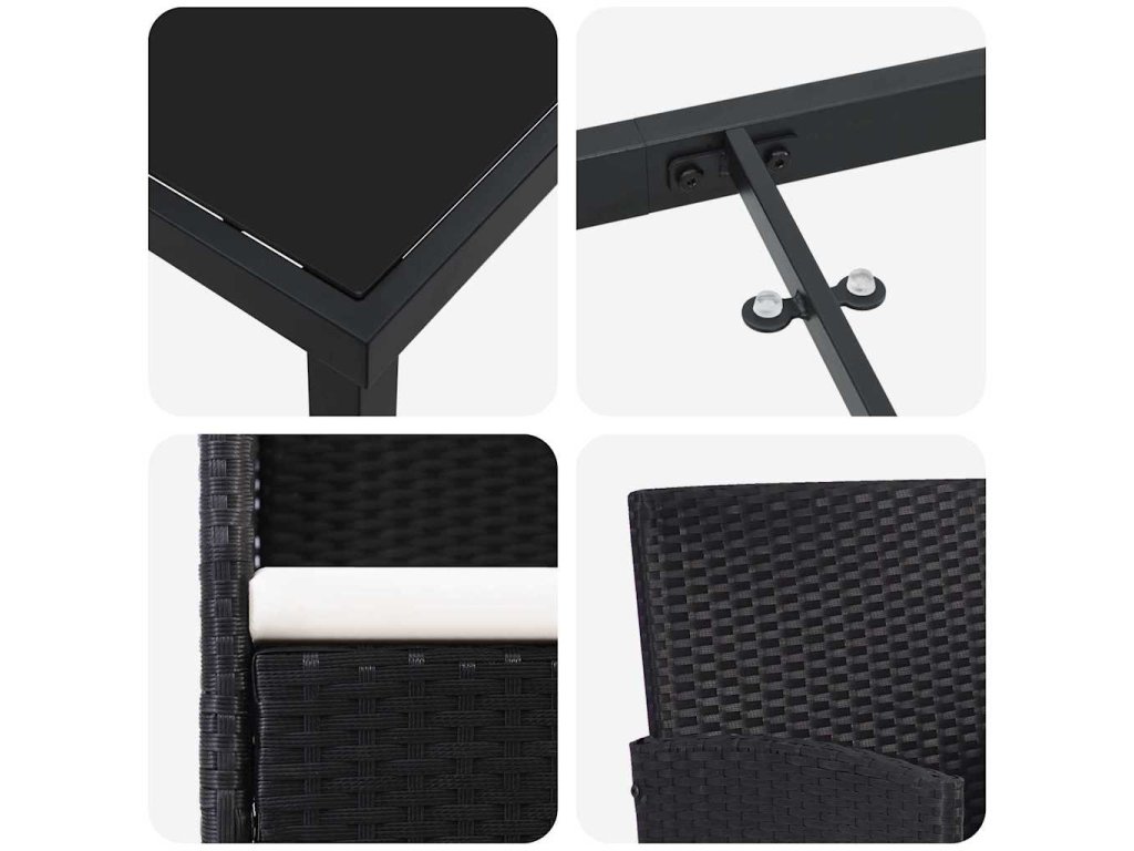 - Co je v sadě Takhle sada obsahuje venkovní polštáře vyrobené z voděodolného materiálu pro dlouhé pohodlí, tvrzený skleněný stůl, který je stylový a snadno se čistí, a pevné, práškově lakované ocelové nohy pro stabilní oporu.