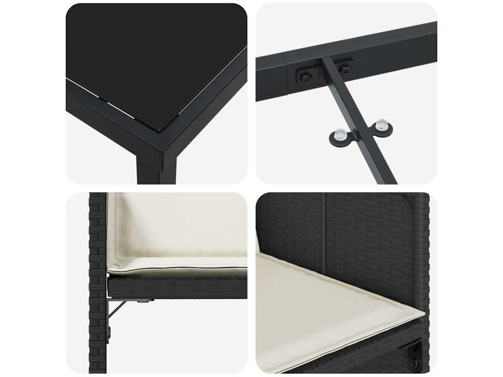 - Komponenty: Skládací prvky s praktickým klapkovým systémem na polštářích sedáku pro pohodlí, jsou vyrobeny z odolné látky pro dlouhé venkovní používání. Stůl z tvrzeného skla dodává eleganci a také zůstává praktický.