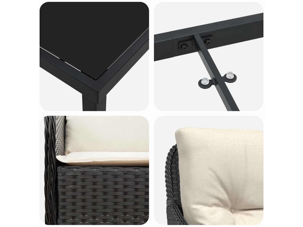 - Materiály: Set kombinuje poly ratan a práškově lakovanou ocel pro styl a odolnost. Tato kombinace dodává elegantní vzhled a je dost robustní na to, aby odolala každému počasí. Tkaná struktura poly ratanu se hezky doplňuje s ochranným nátěrem na oceli, což jí pomáhá dlouho vypadat čerstvě.