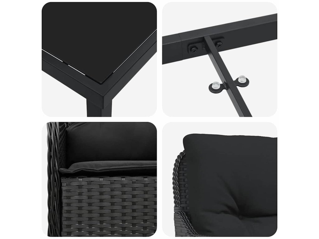 - Materiály: Set kombinuje poly ratan a práškově lakovanou ocel pro styl a odolnost. Tato kombinace dodává elegantní vzhled a je dost robustní na to, aby odolala každému počasí. Tkaná struktura poly ratanu se hezky doplňuje s ochranným nátěrem na oceli, což jí pomáhá dlouho vypadat čerstvě.