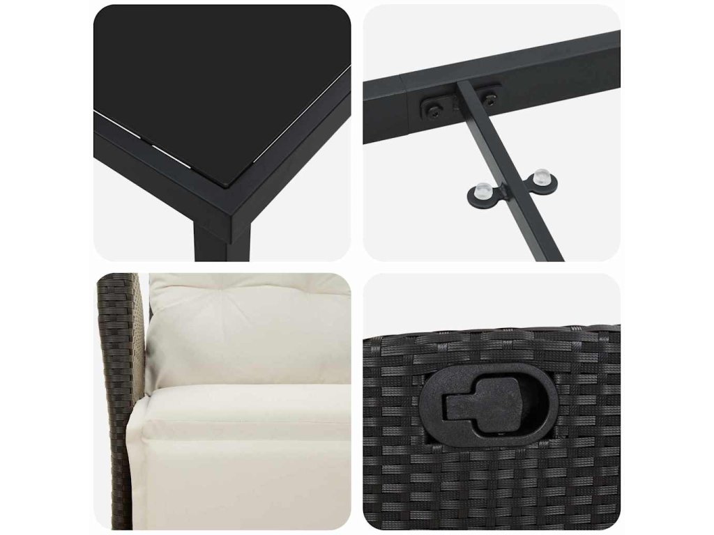 Prémiové materiály: Set je vyroben z poly ratanu, který dlouho vydrží a neztrácí svou krásu, a to ani po vystavení slunci a dešti. Nastavitelné opěrky nohou: Každá židle má nastavitelné opěrky nohou, takže si je můžete přizpůsobit přesně podle sebe pro maximální pohodlí. Komplexní komponenty: Všechny díly, od tvrzeného skleněného stolu po poly ratanové opěráky, jsou šikovně vybrány pro harmonické používání a podporu stability. Doporučené použití: Ideální na zahradu nebo terasu, hodí se pro jakékoli jídlo, ať už chcete mít romantickou večeři nebo velkou oslavu. Moderní design zapadne do jakéhokoli stylu. Údržba: Aby set zůstal hezký, doporučuje se použít kryt, když ho nepoužíváte, a chránit ho před deštěm a slunečním zářením. To zajistí, že vám bude dlouho sloužit s stylem.- Barva: Černá