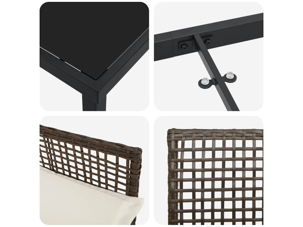 - Kompletní set: Obsahuje vše potřebné včetně stabilního skleněného stolu, pohodlných polštářů z poly ratanu a pevných nohou. Každý prvek je funkční, spojuje komfort a praktičnost pro bezproblémové venkovní aktivity. Set dělá z venkovního stolování příjemný zážitek a je ideální pro rodinná jídla nebo večírky s přáteli.