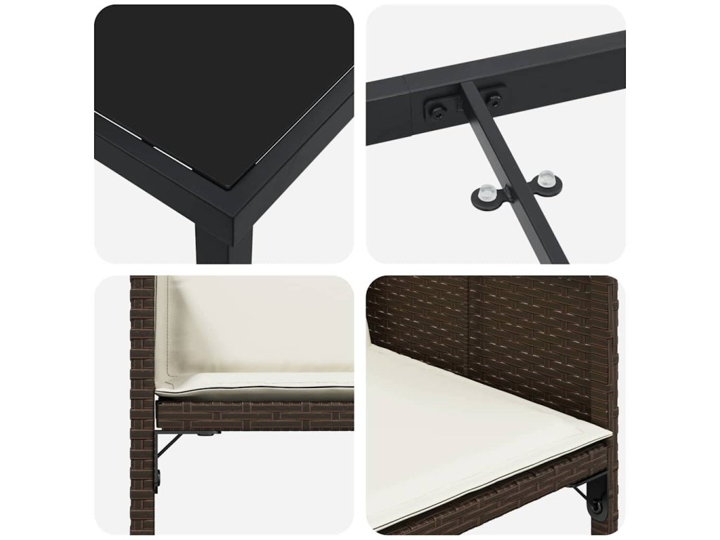 - Materiály: Vyrobeno z kvalitního poly ratanu s ručně tkaným designem, který vypadá skvěle a vydrží. Pevný rám z práškově lakované oceli je rezistantní, takže je spolehlivý v různém počasí. Tvrzený skleněný stůl je elegantní a snadno se udržuje, což z něj dělá super kousek do vaší zahrady.
