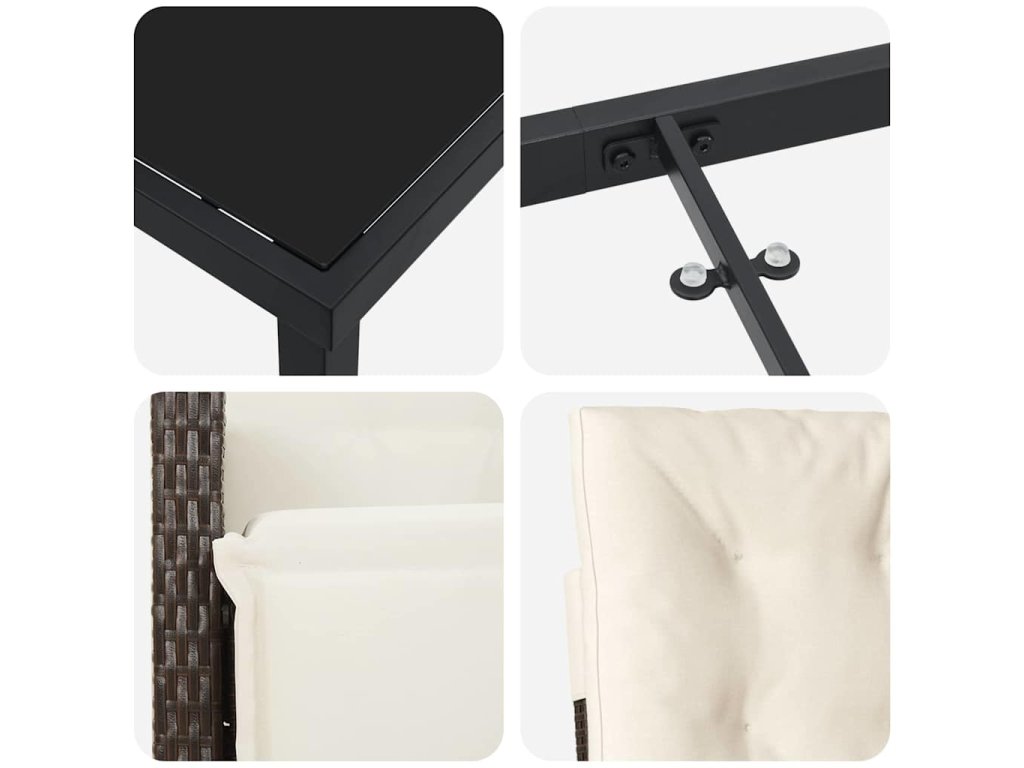 Materiály: Tento jídelní set je z různých materiálů, včetně poly ratanu na sedadlech, což zajišťuje odolný a voděodolný povrch příjemný na dotek. Takový materiál slibuje dlouhou životnost a málo údržby, idealní pro venkovní použití bez kompromisů na pohodlí či vzhled. Součásti: Set zahrnuje silný ocelový rám a poly ratanová opěradla, i ergonomické opěrky rukou na pohodlné sezení. Černý skleněný stoleček dodává šmrnc a snadno se čistí. Nastavitelný a funkční design: Jídelní set nabízí opěradlo s vícero polohami pro přizpůsobitelné pohodlí, jak pro lenošení, tak stolování. Manuální nastavení jednoduše přizpůsobí set vašim potřebám bez žádných složitých mechanik. Doporučené použití: Perfektní pro zahrady a terasy, tento set nabízí stylové jídelní řešení na léto. Jeho elegantní design je ideální pro rodinné večeře nebo večírky venku. Údržba: Údržba je snadná, stačí dodržovat jednoduché pokyny: zakrývat, když se nepoužívá, pro prodloužení životnosti, a umýt mýdlem a vodou pro udržení vzhledu.- Barva: Hnědá