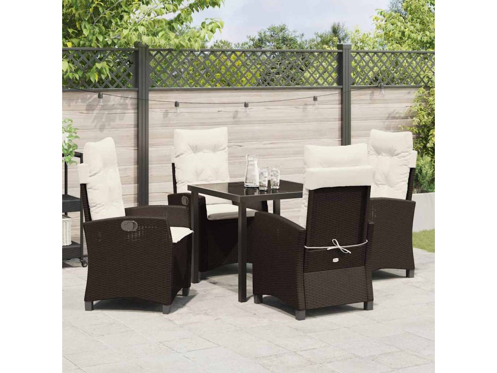 Materiály: Vyrobeno z odolného poly ratanu, tento jídelní set kombinuje styl s odolností. Tvrzené sklo zvyšuje jeho moderní vzhled a usnadňuje údržbu, takže se lehce čistí. Ocelové rámy dávají stabilitu a dlouhou životnost, bez ztráty stylu. Zahrnuté komponenty: Představ si příjemný zážitek díky sedacím polštářkům, co nabízejí pohodlí. Opěrky a lesklé nohy se skvěle doplňují. Skleněný stůl spojuje funkčnost s elegancí. Vícepolohová opěradla zajistí pohodlný relax s různými náklony. Funkce / Funkčnost / Design: Tento moderní zahradní set vyniká nastavitelnými opěradly, ideálními pro komfortní venkovní odpočinek. Ocelové nožky zajišťují robustní stabilitu, elegantní černý povrch ladí s jakýmkoli stylem. Manuální nastavení přidává praktičnost a spojuje formu s funkcí ve tvém zahradním ráji. Doporučené použití: Tento set je ideální pro zahradní a terasové stolování. Užij si víkendové brunch nebo večeře pod hvězdným nebem. Perfektně se hodí na různé příležitosti, od příjemných rodinných obědů po formální akce, a snadno zapadne do každého společenského prostředí. Péče a údržba: Pro dlouhou životnost používej ochranné kryty, když set není v provozu. Skleněný povrch stačí utřít, aby si zachoval lesk. Polštáře udržuj svěží sušením vzduchem, aby set zůstal příjemným místem pro nezapomenutelné chvíle venku.- Barva: Hnědá