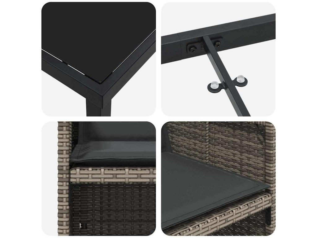 Tento trendy zahradní set posune váš venkovní životní prostor o úroveň výš díky modernímu designu a praktickým funkcím. Je super pro zahrady a terasy, přetváří obyčejná místa na elegantní, relaxační kouty, kde si užijete čas s přáteli a rodinou. Jeho pevná konstrukce a tkaná textura mají nadčasovou eleganci, která se hodí do každého domova.