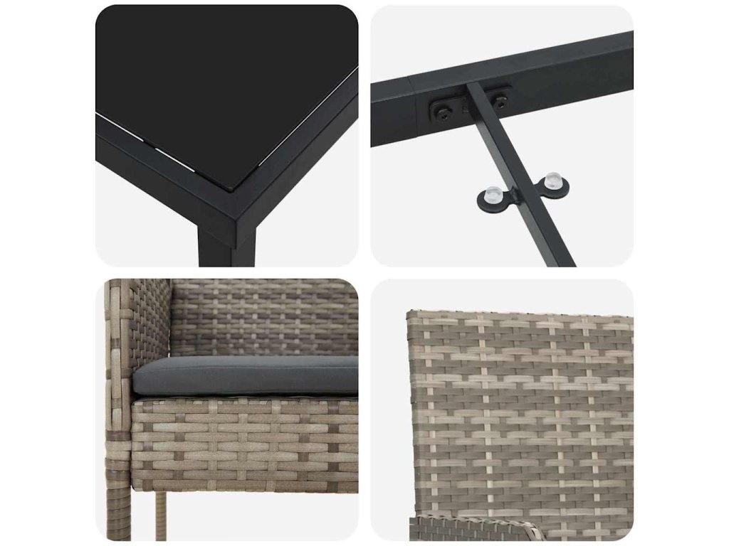 Tato souprava na venkovní sezení perfektně spojuje moderní styl a praktičnost, ideální pro každého, kdo si užívá odpočinkové chvíle ve své zahradě nebo na terase. S čistými liniemi a chytrými materiály se hodí do každého venkovního prostoru. Je skvělá pro milovníky zahrad a pro ty, kdo si chtějí užít dobrou společnost, přináší uvolněnou atmosféru a elegantní vzhled.