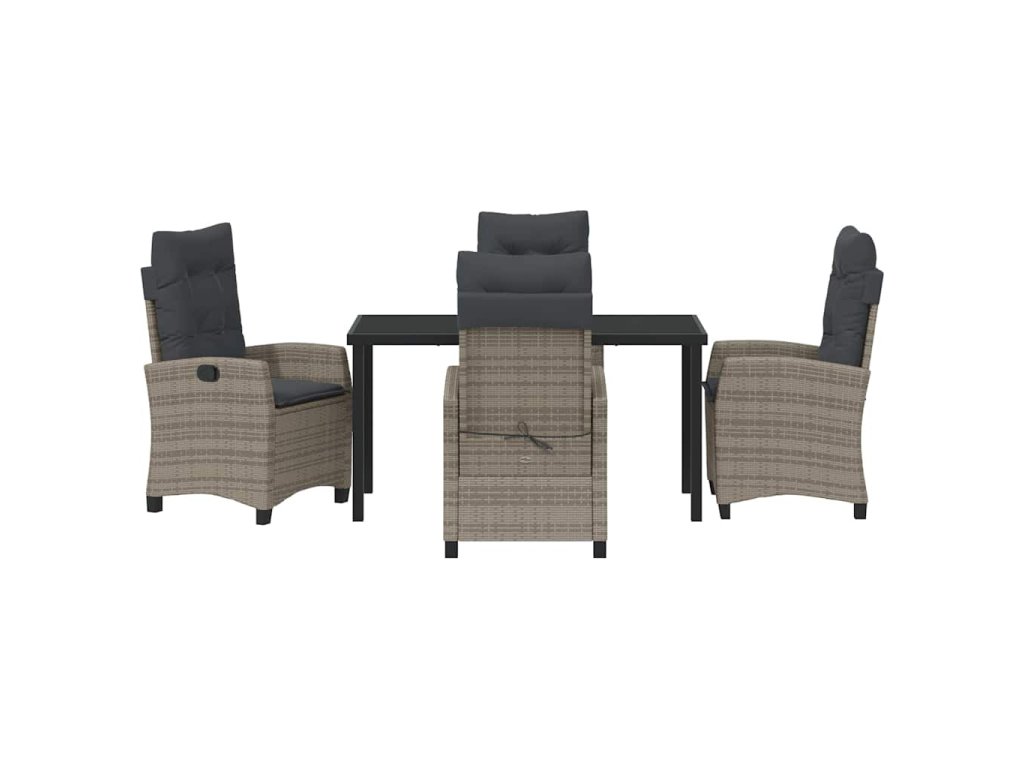 Materiály: Vyrobeno z odolného poly ratanu, tento jídelní set kombinuje styl s odolností. Tvrzené sklo zvyšuje jeho moderní vzhled a usnadňuje údržbu, takže se lehce čistí. Ocelové rámy dávají stabilitu a dlouhou životnost, bez ztráty stylu. Zahrnuté komponenty: Představ si příjemný zážitek díky sedacím polštářkům, co nabízejí pohodlí. Opěrky a lesklé nohy se skvěle doplňují. Skleněný stůl spojuje funkčnost s elegancí. Vícepolohová opěradla zajistí pohodlný relax s různými náklony. Funkce / Funkčnost / Design: Tento moderní zahradní set vyniká nastavitelnými opěradly, ideálními pro komfortní venkovní odpočinek. Ocelové nožky zajišťují robustní stabilitu, elegantní černý povrch ladí s jakýmkoli stylem. Manuální nastavení přidává praktičnost a spojuje formu s funkcí ve tvém zahradním ráji. Doporučené použití: Tento set je ideální pro zahradní a terasové stolování. Užij si víkendové brunch nebo večeře pod hvězdným nebem. Perfektně se hodí na různé příležitosti, od příjemných rodinných obědů po formální akce, a snadno zapadne do každého společenského prostředí. Péče a údržba: Pro dlouhou životnost používej ochranné kryty, když set není v provozu. Skleněný povrch stačí utřít, aby si zachoval lesk. Polštáře udržuj svěží sušením vzduchem, aby set zůstal příjemným místem pro nezapomenutelné chvíle venku.- Barva: Šedá
