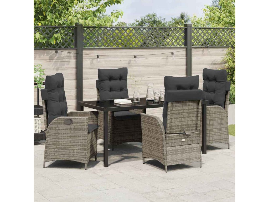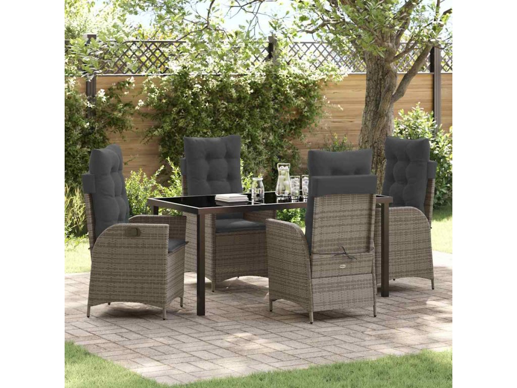 Kvalitní materiály: Set je hlavně z polyratanu, takže je odolný a vypadá skvěle. Elegantní skleněný stůl se krásně doplňuje s polyratanem a dodává mu jemný styl. Stabilní konstrukce: Ocelový rám a opěrky zaručují pevnost a dlouhou životnost. Pohodlné polstrování zvyšuje komfort, zatímco moderní skleněná deska dodává na stylovosti. Flexibilita sezení: Set má vícepolohová opěradla, což umožňuje pohodlně nastavit polohu podle potřeby. Skvělé pro stolování i relaxaci. Univerzální využití: Oceníte ho na zahradě i na terase, ideální pro různé společenské akce nebo klidné večery. Jeho moderní elegance se hodí do každého interiéru. Snadná údržba: Doporučuje se používat kryt na venkovní nábytek, když set nepoužíváte, aby se ochránil před nepříznivým počasím. Tento jednoduchý krok prodlouží jeho životnost a udrží ho krásný i po letech.- Barva: Šedá