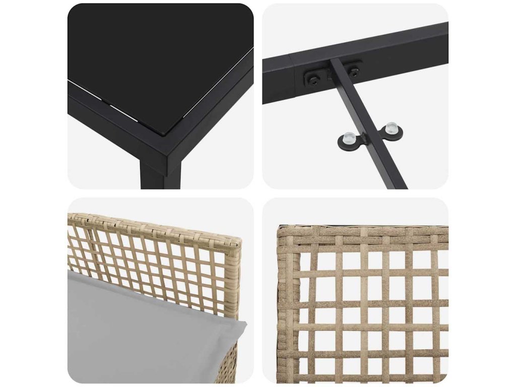 - Kompletní set: Obsahuje vše potřebné včetně stabilního skleněného stolu, pohodlných polštářů z poly ratanu a pevných nohou. Každý prvek je funkční, spojuje komfort a praktičnost pro bezproblémové venkovní aktivity. Set dělá z venkovního stolování příjemný zážitek a je ideální pro rodinná jídla nebo večírky s přáteli.