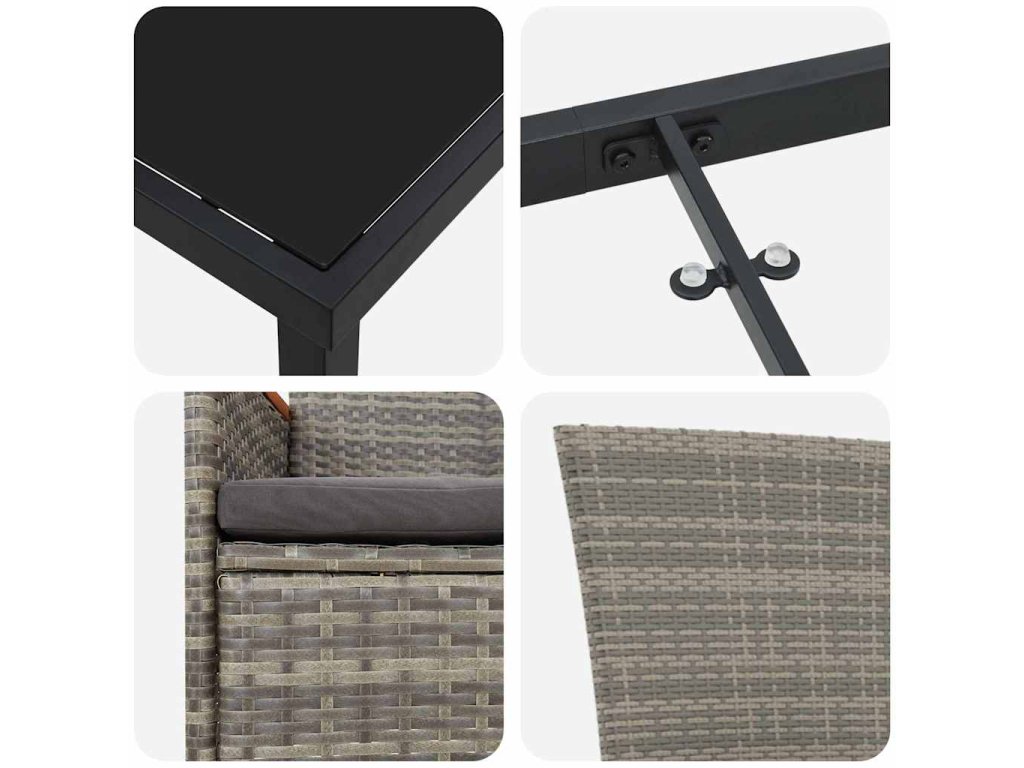 Tahle trendy zahradní lounge souprava dodá tvojí venkovní oblasti stylovou atmosféru. Má elegantní design, který změní každou zahradu nebo terasu na skálaga místo pro setkání s přáteli, rodinou, nebo jen tak na relax. Textura poly ratanu a tvrzený skleněný vršek vytvářejí senzační mix, suitable for co vypadá skvěle a skvěle funguje. Ať už máš hosty nebo si užíváš klidný moment, tahle lounge souprava ti nabídne pohodlí a styl.