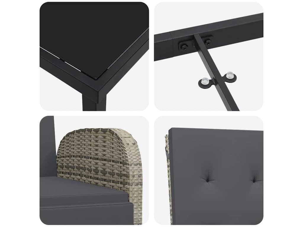 Tento moderní zahradní nábytek je kombinací stylu a praktičnosti. Zvýší úroveň tvého venkovního prostoru, ať už na zahradě nebo terase. Je z odolných materiálů a má skvělý design, takže je perfektní pro hosty nebo lenošení na slunci. Je to výrazný kousek, který vytvoří příjemnou atmosféru svým jednoduchým, minimalistickým stylem. Šedé odstíny a tkaná textura dodávají nádech elegance a spojují styl s pohodlím. Tento nábytek je navržen tak, aby uspokojil potřeby každého, kdo ocení design i užitečnost, což z něj dělá skvělou volbu pro venkovní akce nebo klidné chvíle o samotě.