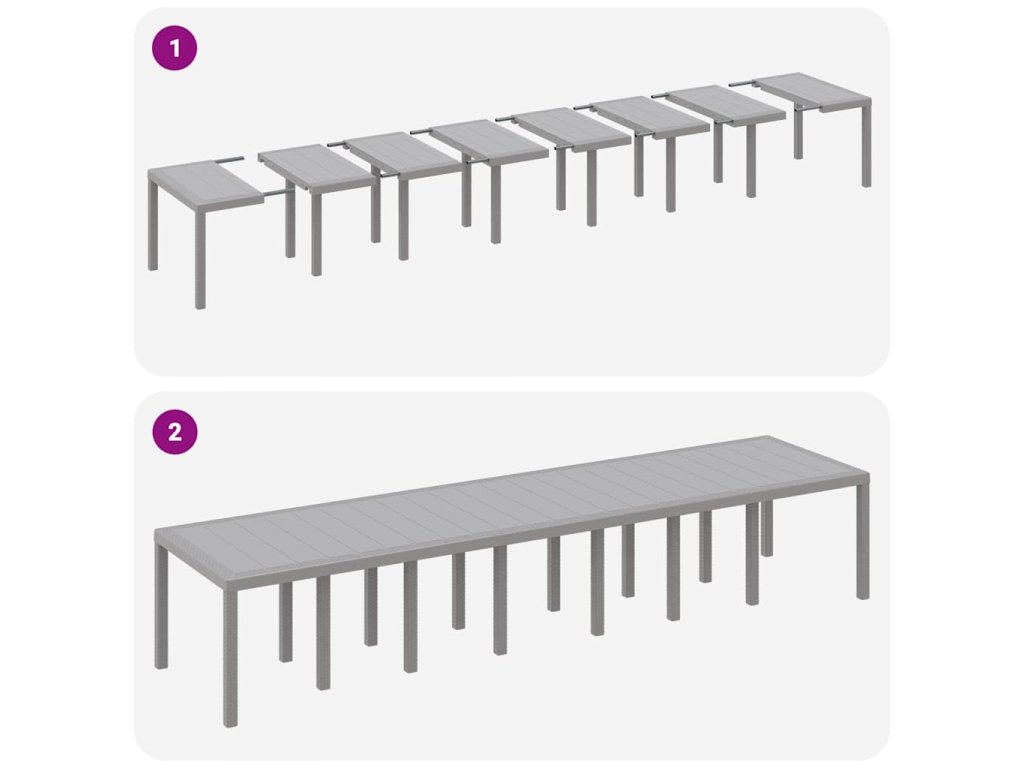 Poly ratanová konstrukce Set je vyrobený z poly ratanu, který je známý svojí trvanlivostí a skvělým vzhledem. Je odolný vůči letnímu počasí a zachovává si svůj vzhled i během času. Snadno se udržuje a spojuje styl s funkčností, takže je ideální pro venkovní použití. Pohodlí sezení Každé sedadlo má příjemné polstrování, které zaručuje pohodlí při delším sezení. Rám z poly ratanu poskytuje oporu, což umocňuje zážitek ze sezení. Skvělé na zahradní párty nebo rodinné sejítí, kde je pohodlí na prvním místě. Ploché opěrky rukou Ploché opěrky rukou zvyšují pohodlí a dělají celý set ještě elegantnější. Tento designový prvek podtrhuje jednoduchost a funkčnost setu, dokonale ladí s moderními trendy, kde funkce jde ruku v ruce s designem. Prostorné uspořádání Měří 400 x 100 cm, což nabízí dostatek místa pro velké skupiny. Je to ideální místo pro zábavu hostů s bohatým stolem. Každý má dost místa kolem stolu a to zlepšuje celkový zážitek ze stolování. Snadné sestavení Set se sestavuje ve dvou s šroubovákem. Instrukce jsou jasné, takže sestavení je rychlé a bezproblémové, což zajišťuje stabilní a spolehlivou nabídku pro letní příležitosti.- Barva: Světle šedá