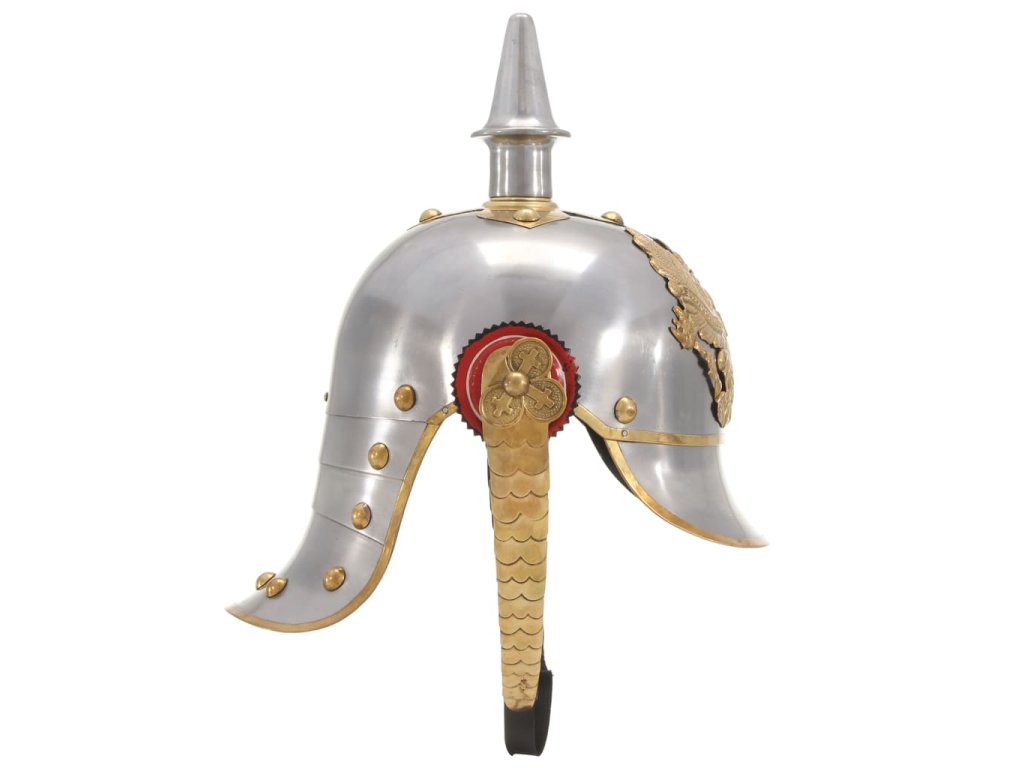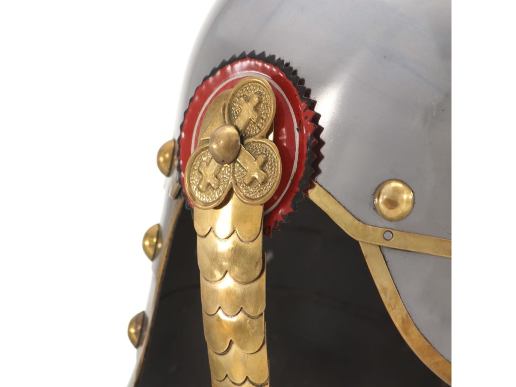 Jedná se o přesnou repliku německé středověké rytířské přilby velitele Hesenského vévodství. Je vyrobená z leštěné oceli 18 s mosazným lemováním a kombinuje původní styl a robustní materiál s atraktivním designem, který dokonale doplní vaši válečnickou výbavu. Přilba je ovšem také působivá dekorace a je ideální pro kostýmové a další společenské události.