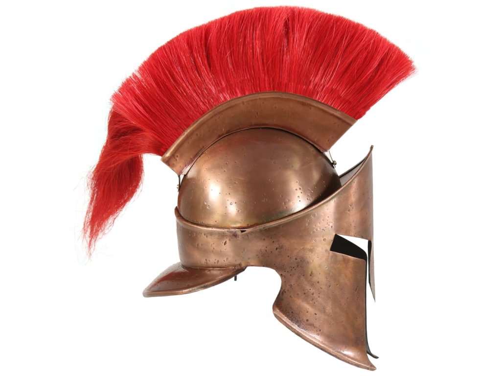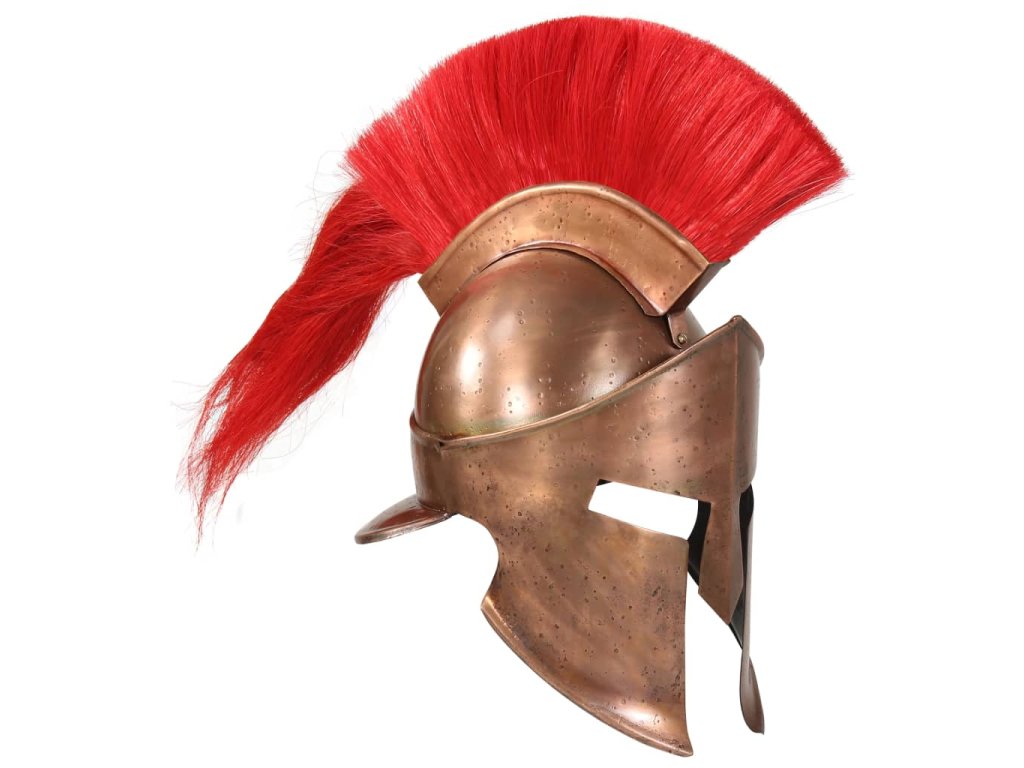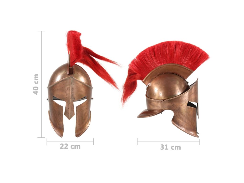 Přilba je přesná replika původní řecké starověké přilby vojenské uniformy. Je zhotovená z oceli 18. Kombinací původního designu s odolným materiálem vznikla působivá přilba, která dokonale doplní vaši stávající výbavu. Tato helma krále Leonidase s červeným chocholem má dvě dlouhé lícnice, které chrání obličej a ve středu se spojují ve tvaru T. Tato replika je také působivým výstavním kusem.