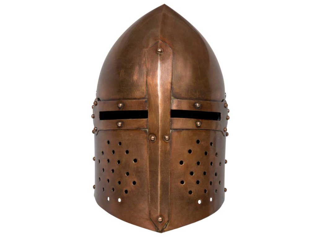 Helma je přesná replika původní středověké křižácké přilby. Je zhotovená z oceli 18. Kombinací původního designu s odolným materiálem vznikla působivá helma, která dokonale doplní vaši stávající rytířskou zbroj. Přilba, která zcela zakrývá hlavu, krk a bradu, je plně nositelná. Malé otvory a průzory slouží k ventilaci a dobrému výhledu. Jedná se také o působivý výstavní kousek.