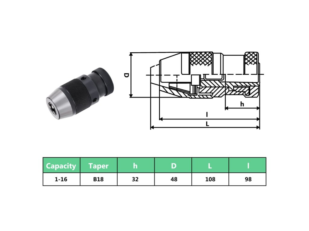Toto sklíčidlo je vyrobené z žáruvzdorné oceli s vysokou tvrdostí, vysokou přesností a odolností proti korozi. Bezklíčový design, utahování a uvolňování rukou nabízí rychlejší a snadnější upnutí a uvolnění. Unikátní tahové ložisko napomáhá přeměně točivého momentu v rukojeti do větší upínací síly.
